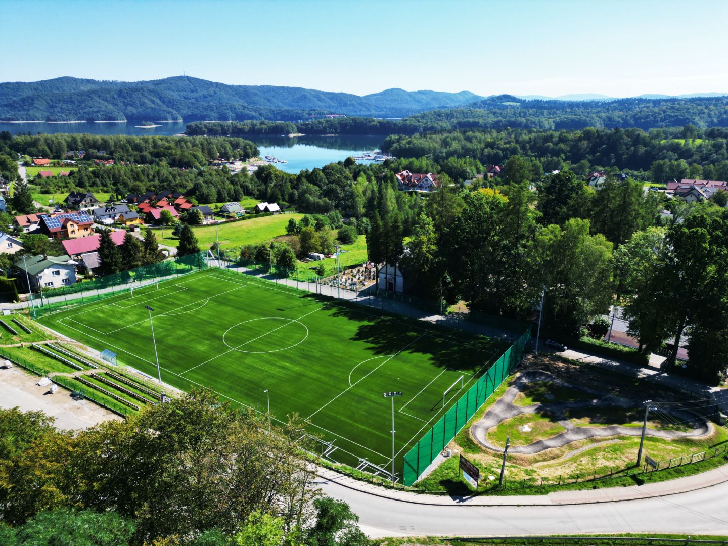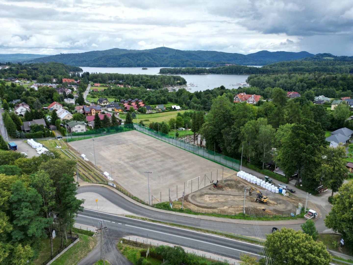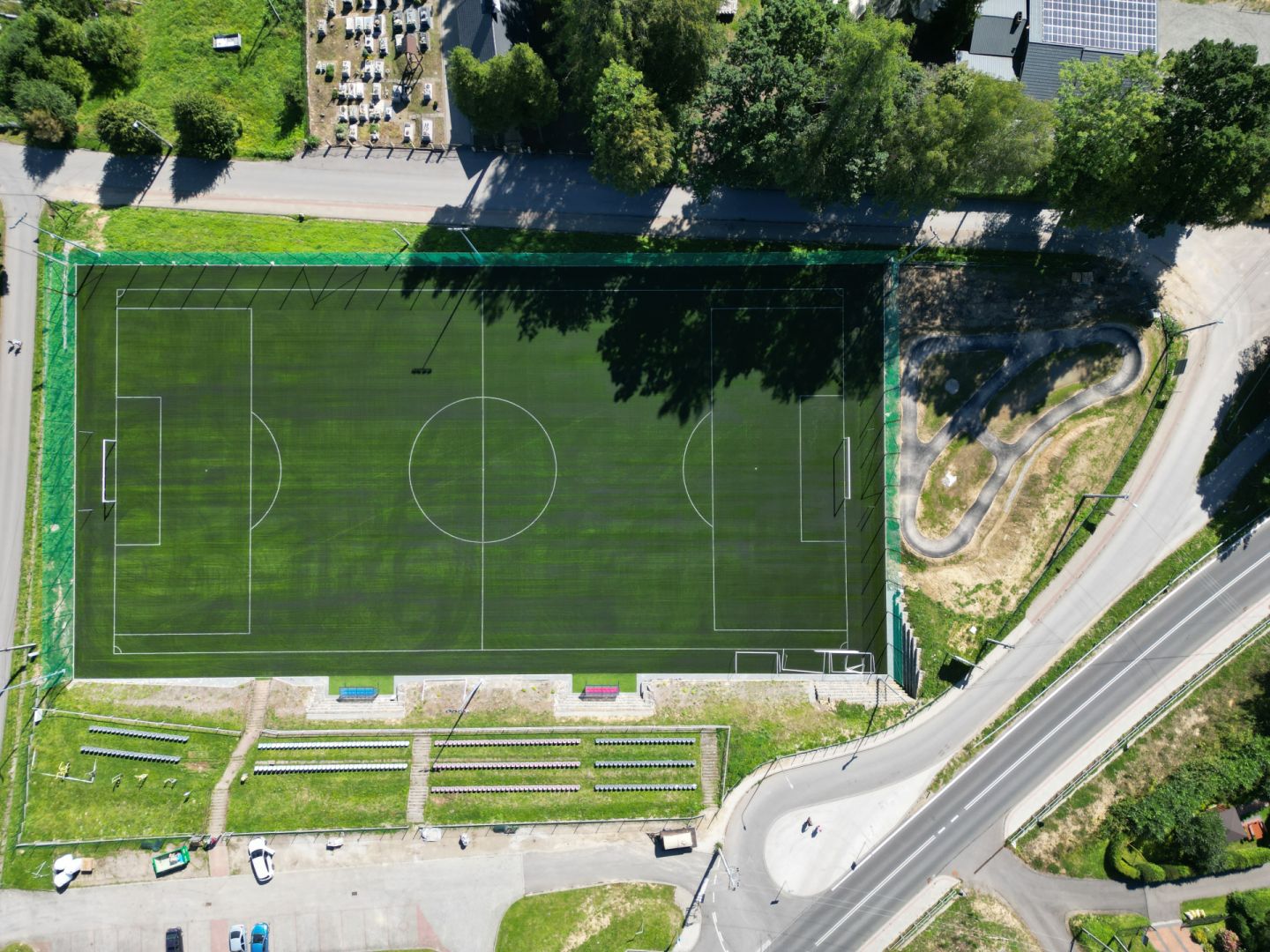 Budowa pełnowymiarowego boiska sportowego Klasy B, o nawierzchni ze sztucznej trawy, wraz wiatami dla zawodników, piłkochwytami, oraz torem rowerowym typu "Pumptrack".