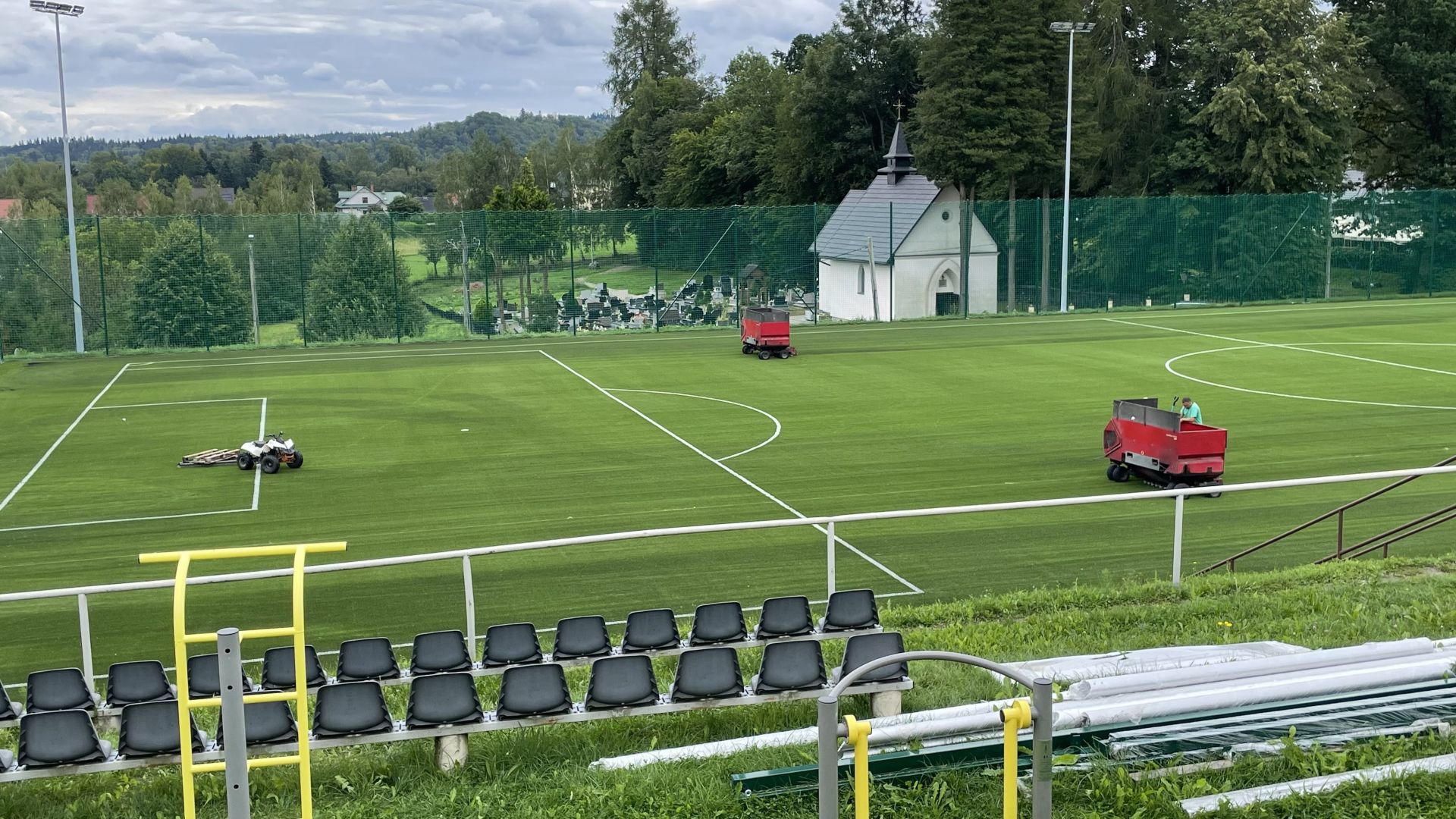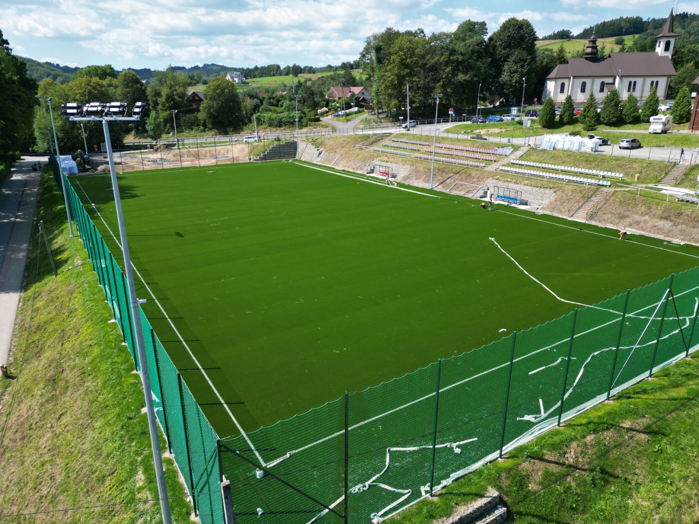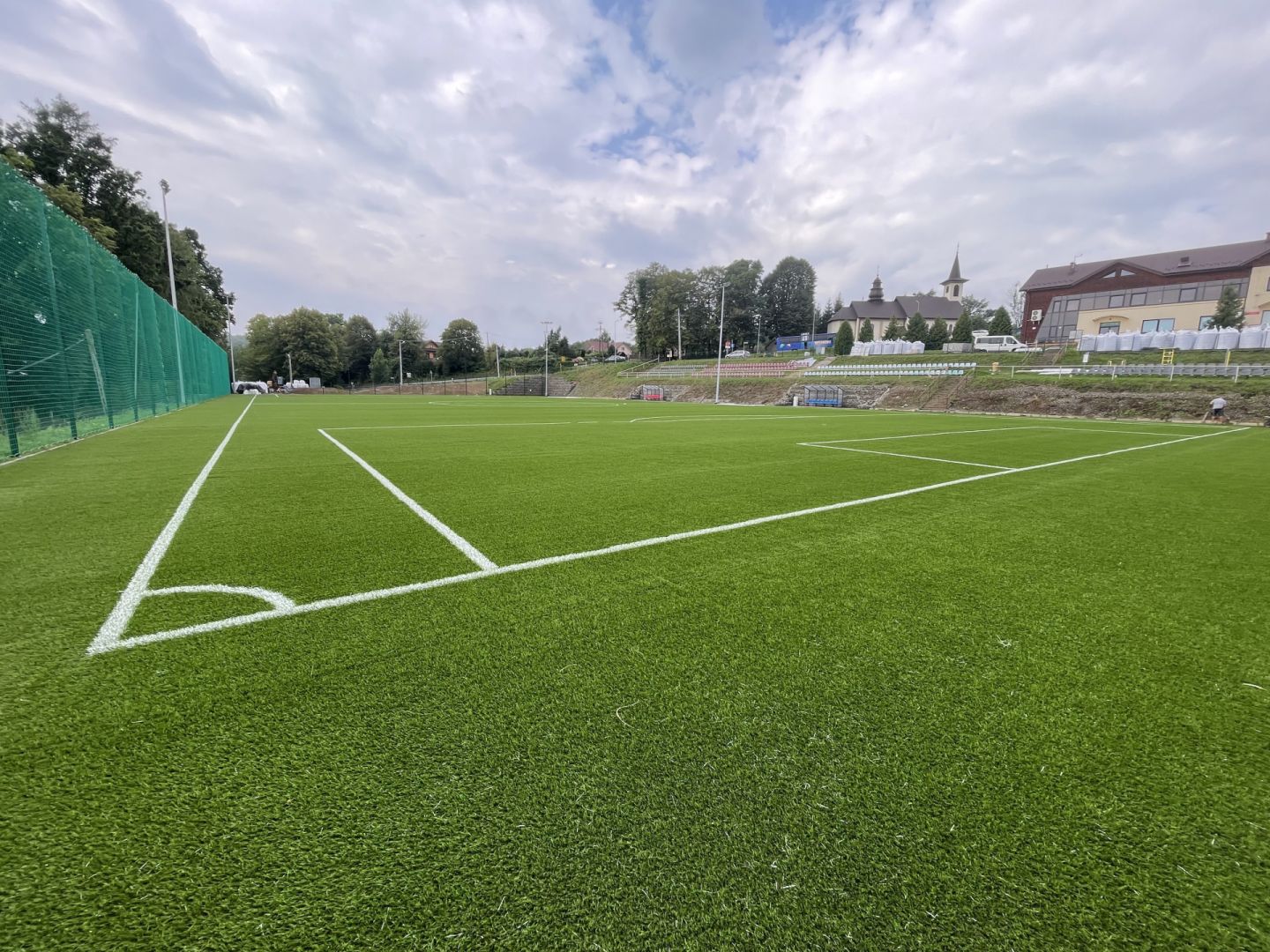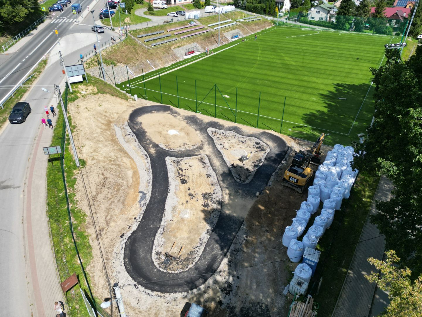 Budowa pełnowymiarowego boiska sportowego Klasy B, o nawierzchni ze sztucznej trawy, wraz wiatami dla zawodników, piłkochwytami, oraz torem rowerowym typu "Pumptrack".