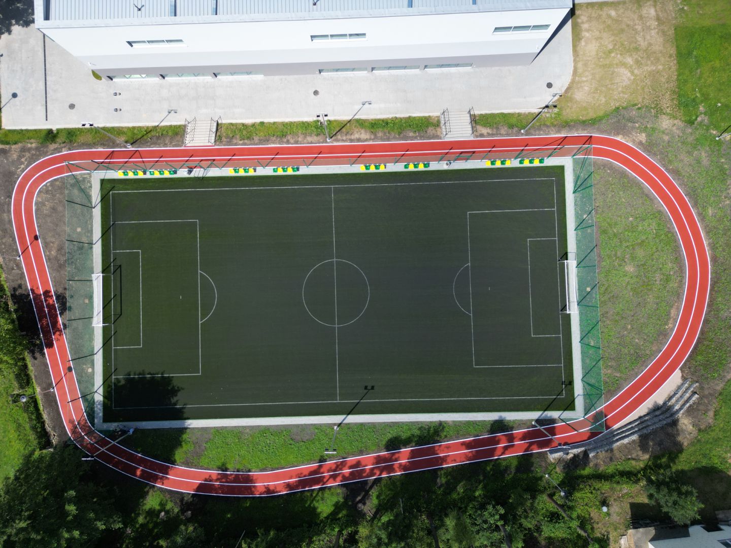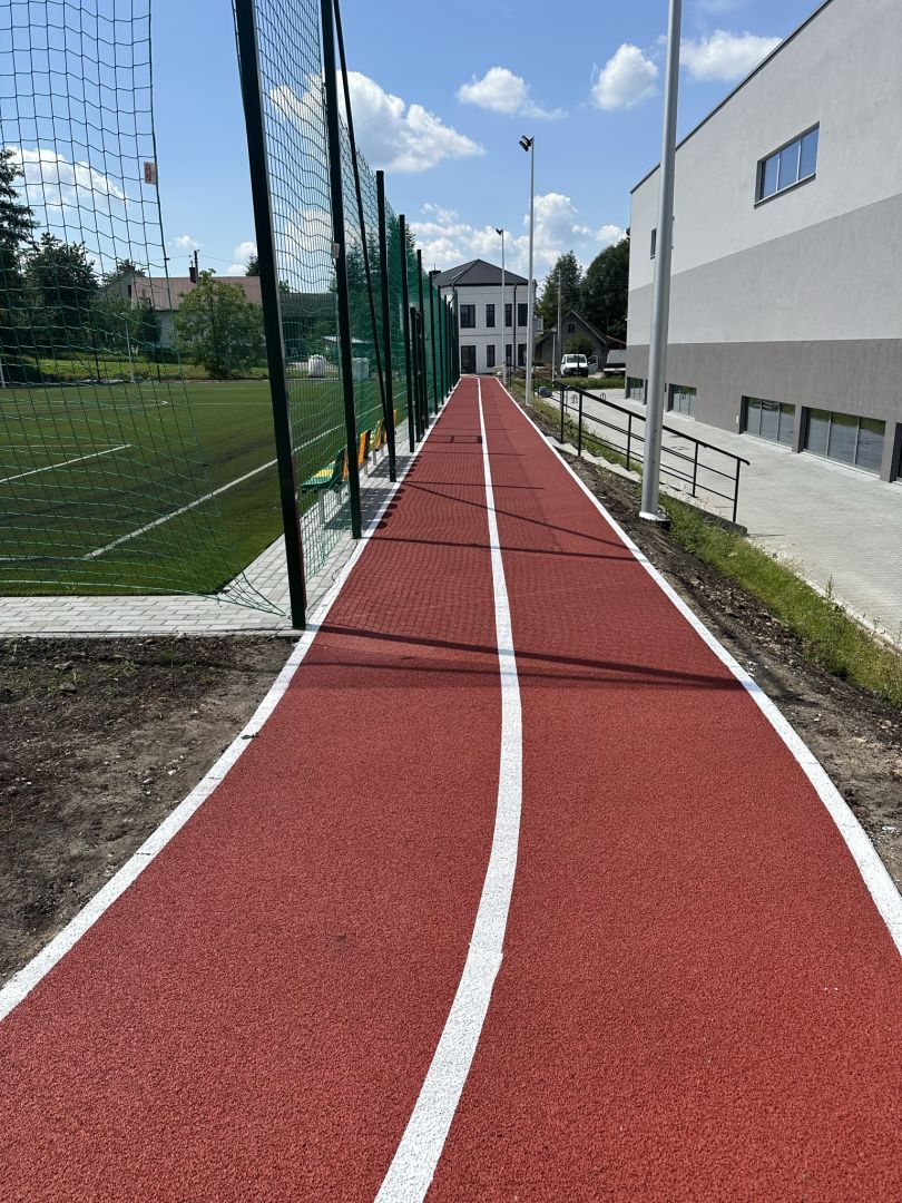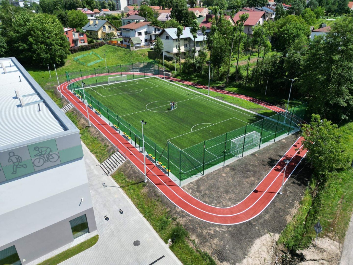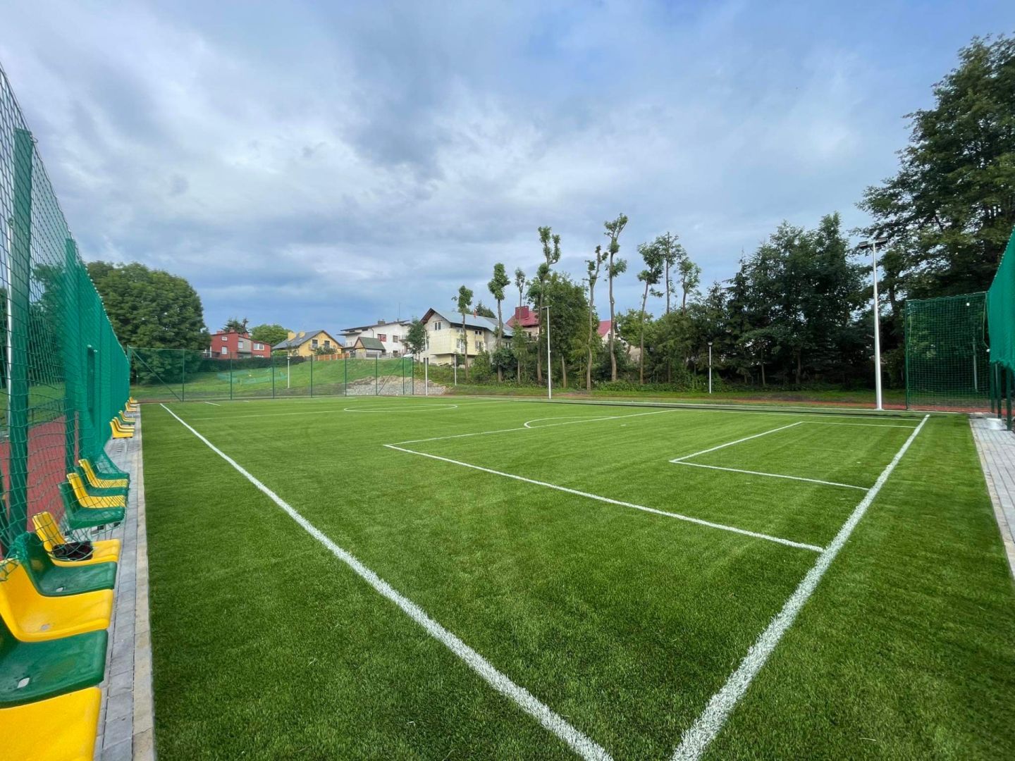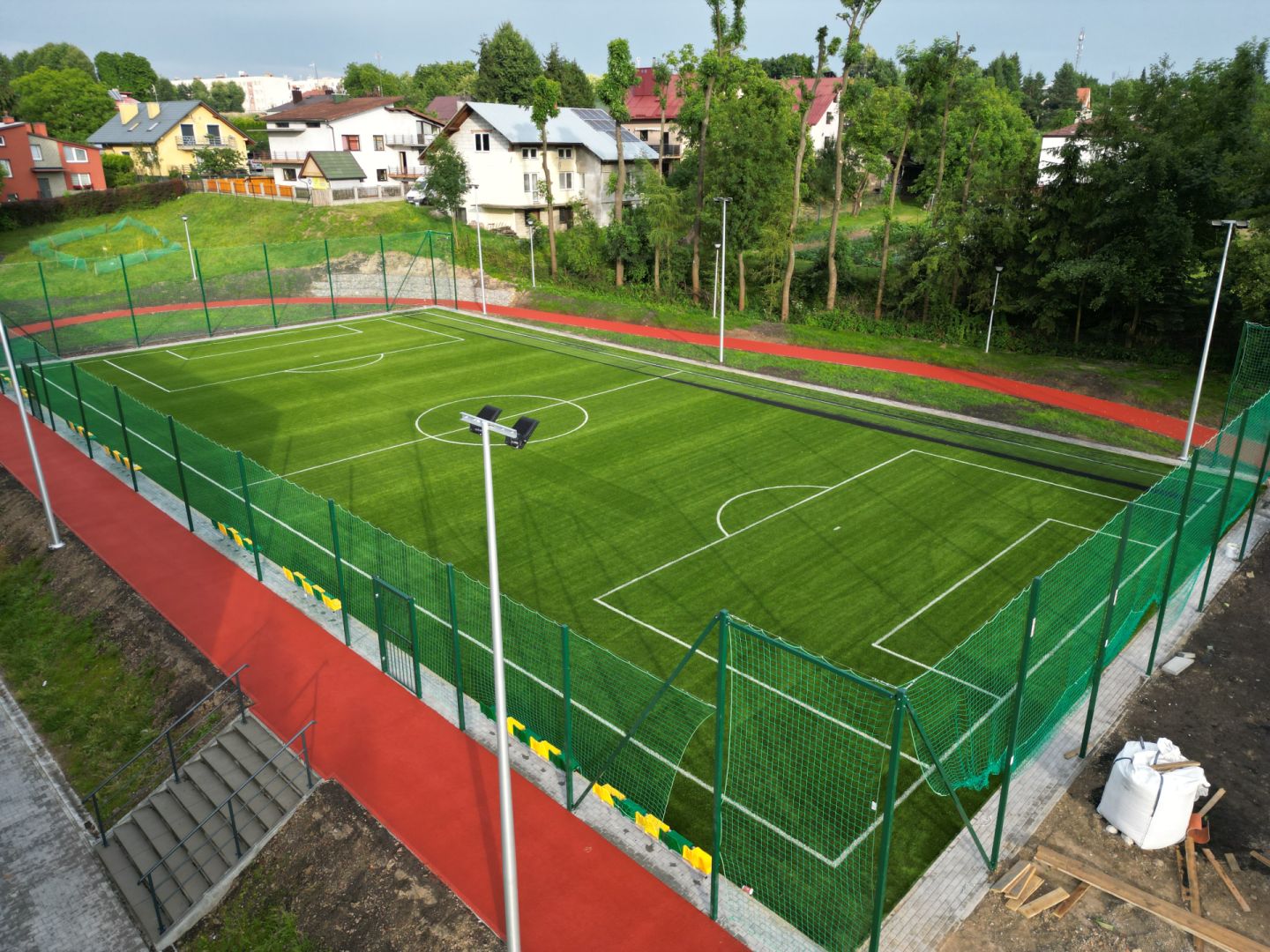 Budowa boiska o nawierzchni ze sztucznej trawy, trybun, piłkochwytów, bieżni o nawierzchni poliuretanowej, odwodnienienia terenu z drenażami, umocnienia skarpy koszami kamienno - siatkowymi, oraz montażem małej architektury i założeniem zieleni.