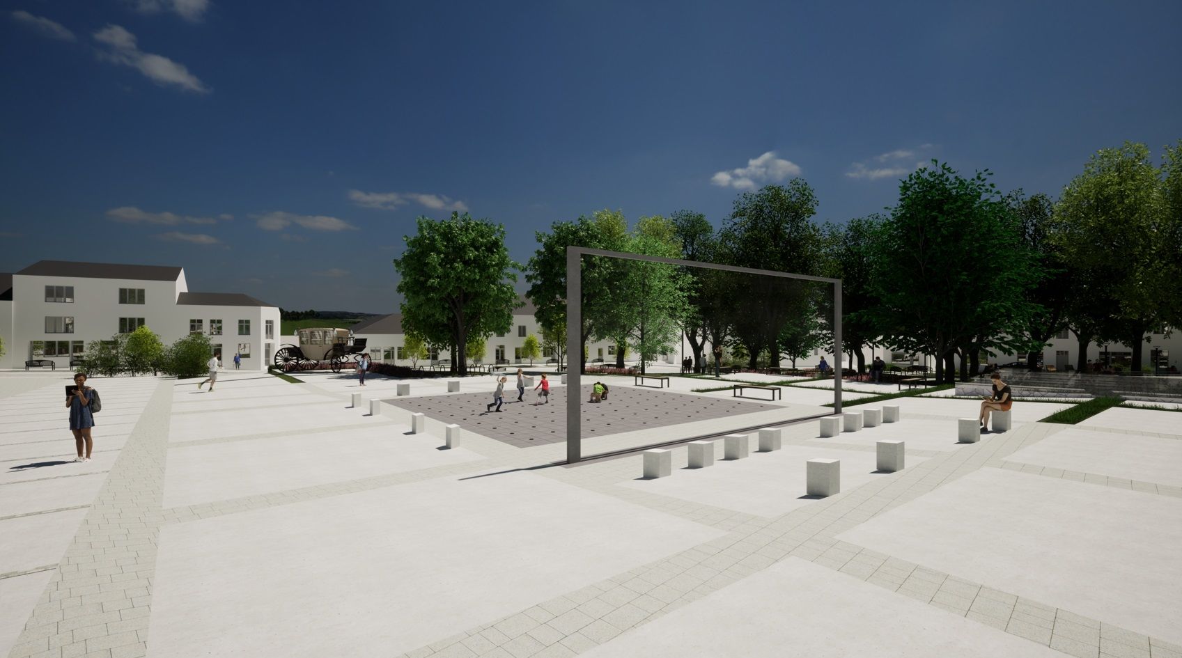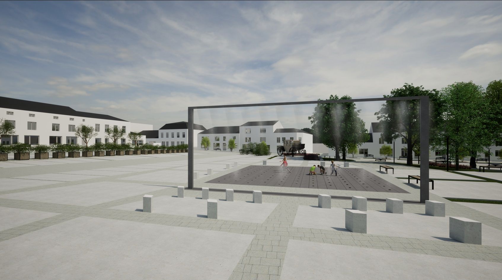 - Budowa fontanny posadzkowej z nawierzchnią z płyt granitowych, podświetlonym systemem dysz wodnych oraz podziemnym systemem uzdatniania wody wraz z komorą techniczną, a także kurtyny wodnej (ekran wodny)