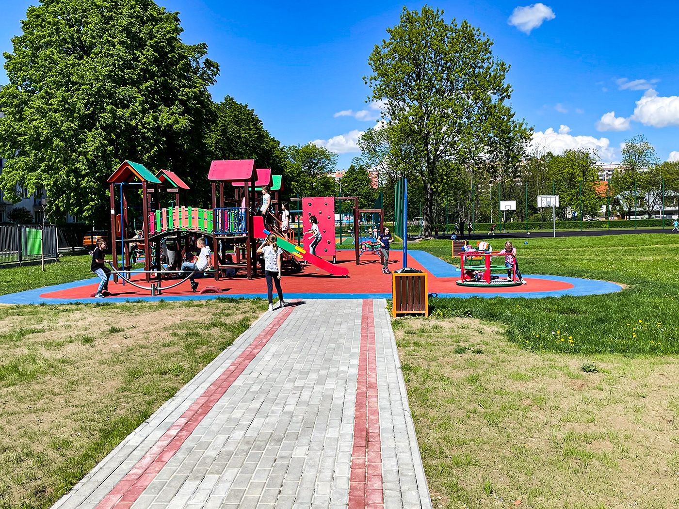 Zakres inwestycji obejmował swoim zakresem wykonanie nawierzchni placu zabaw z masy poliuretanowej. Wykonanie utwardzenia terenu z kostki brukowej betonowej. Wykonanie zieleni wraz z pracami towarzyszącymi.